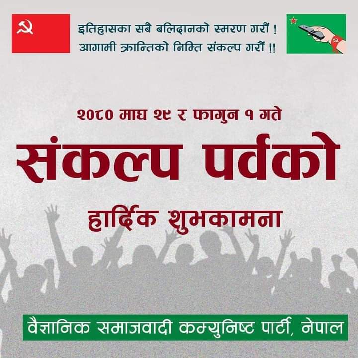 संकल्प पर्व नेपाली समाजको मुख्य सांस्कृतिक पर्व बन्नु पर्दछ । यसको निम्ति वैज्ञानिक समाजवादीहरूले पहलकदमी लिन शुरु गर्नुपर्दछ। वैज्ञानिक समाजवादका पक्षधर सबै राजनीतिक पार्टीहरु, नागरिक समाजका अभियन्ताहरु र न्यायप्रेमी जनसमुदायले हाम्रो पार्टीले व्यवहारकृत गर्दै अघि लैजान चाहेको यो पर्वबारेको अवधारणाबारे आफ्नो स्थानमा गम्भीरतापूर्वक विमर्शमा लैजानु आवश्यक छ। त्यसका निम्ति हामी अपील गर्दछौं। यो क्रमशः वैज्ञानिक समाजवादीहरू र सबै प्रकारका न्याय प्रेमीहरूको साझा सवाल बन्न सक्दछ, बोल्नु सही हुन्छ देशका विभिन्न स्थानमा बन्नु सही हुन्छ। देशका विभिन्न भागमा संकल्प पर्वको सहभोजमा उपस्थित मित्रहरूलाई स्वागत छ। श्रमिक वर्गको मुक्ति, स्वाधीन राष्ट्रको स्थापना र पीडित मानवताको मुक्तिका निम्ति क्रियाशील सम्पूर्ण नेपालीलाई संकल्प पर्वको हार्दिक शुभकामना!
